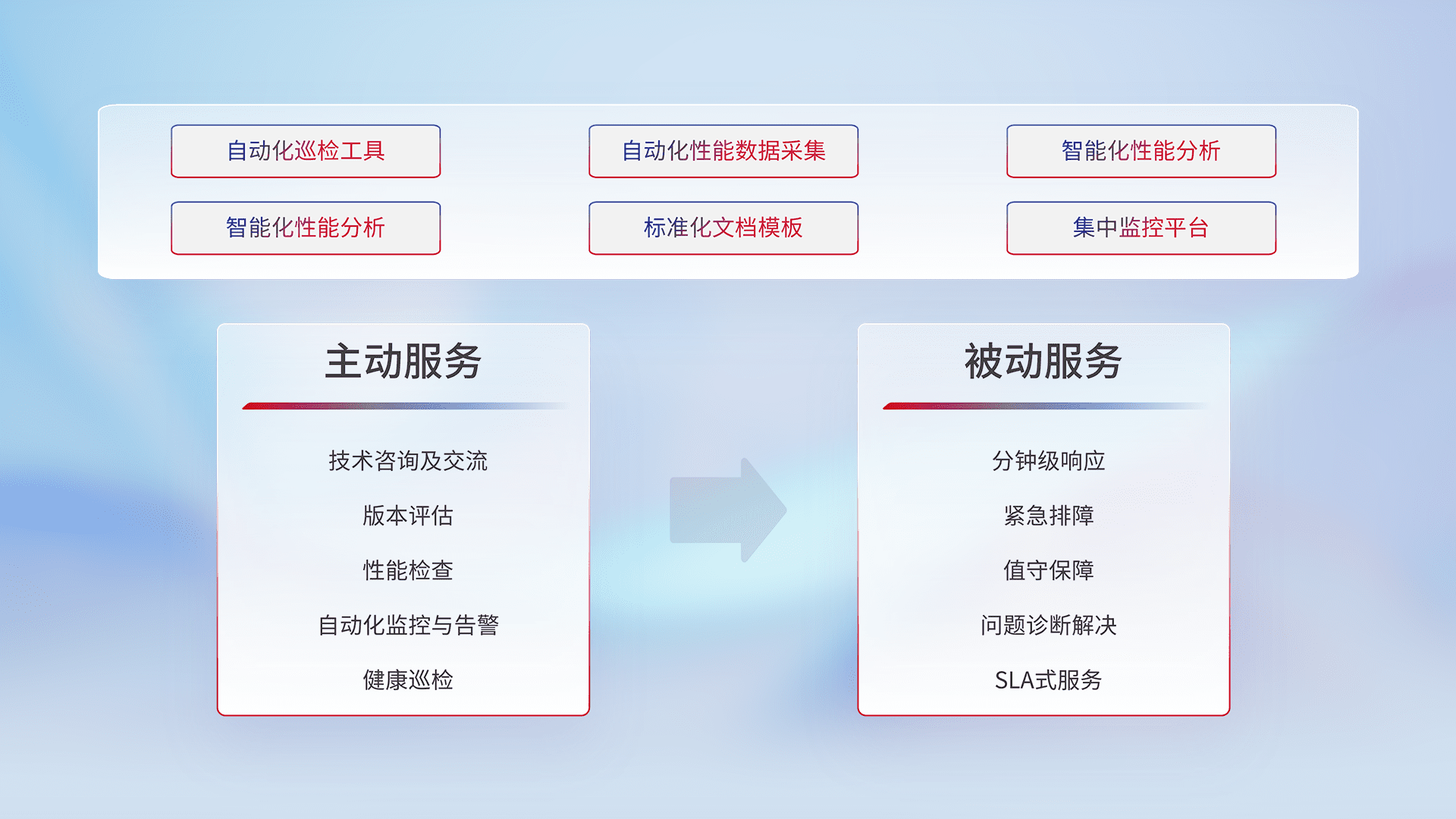 智能化工具和标准化文档,,,保障服务质量,,提供主动服务(包含技术咨询、、、版本评估、、性能检查、、自动化监控与告警、、健康巡检)和被动服务包含(分钟级响应、、、、紧急排障、、值守保障、、、、问题诊断解决、、SLA服务)。。